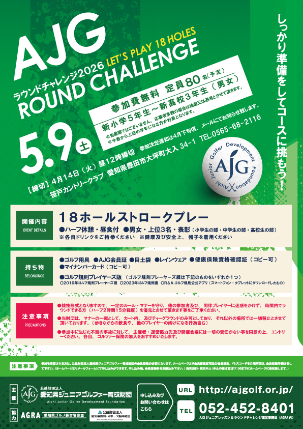 参加中に生じた不測の事故に対して、主催者・運営協力先及び開催会場には一切の責任がない事を同意の上、エントリーください。各自、ゴルファー保険の加入をおすすめいたします。